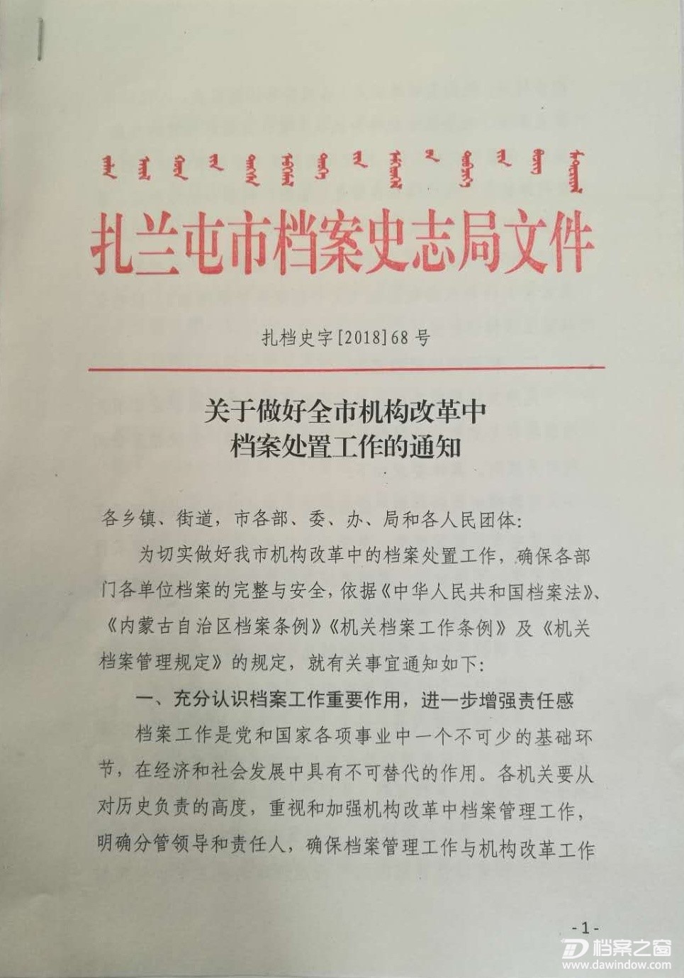 为切实做好我市机构改革中的档案处置工作,确保各部门各单位档案的完整与安全,近日,扎兰屯市档案史志局印发文件《关于做好全市机构改革中档案处置工作的通知》(扎档史字[2018]号),对扎兰屯市机构改革中涉改单位档案的处置和流向、处置范围与内容、工作要求等做了具体规定,要求机构变动的机关要认真做好档案的收集、整理、保管和交接工作,按规定向扎兰屯市档案馆移交档案。任何单位和个人不得私自带走、留存、转移和销毁档案。待机构改革方案确定后,扎兰屯市档案史志局将对各涉改单位进行实地指导,确保档案管理工作与机构改革工作同步进行。