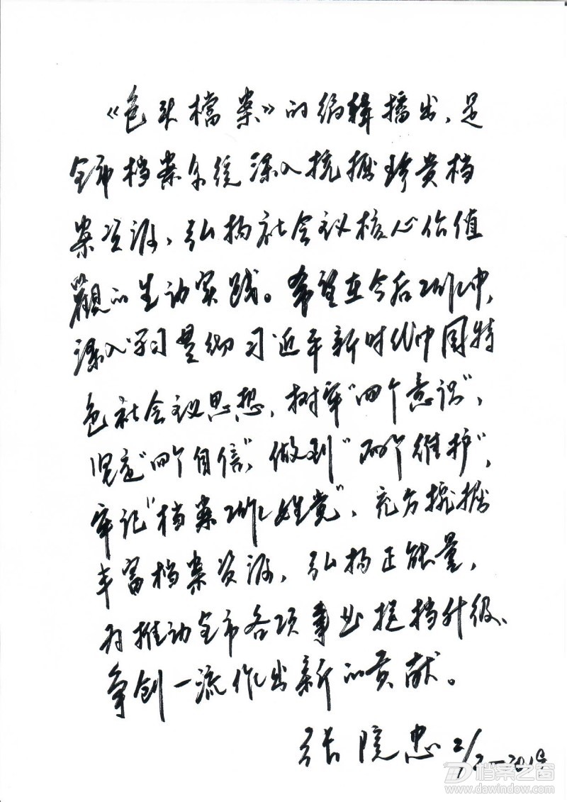 2019年2月2日,内蒙古自治区党委常委、市委书记张院忠对包头市档案局编辑制作的《包头档案》电视纪实片作出重要批示:《包头档案》的编辑播出,是全市档案系统深入挖掘珍贵档案资源,弘扬社会主义核心价值观的生动实践。希望在今后工作中,深入学习贯彻习近平新时代中国特色社会主义思想,树牢“四个意识”,坚定“四个自信”,做到“两个维护”,牢记“档案工作姓党”,充分挖掘丰富档案资源,弘扬正能量,为推动全市各项事业提档升级、争创一流作出新的贡献。