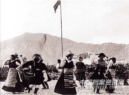 1951年,西藏人民和进藏部队在布达拉宫前载歌载舞,欢庆西藏和平解放。五星红旗在广场上空迎风飘扬。