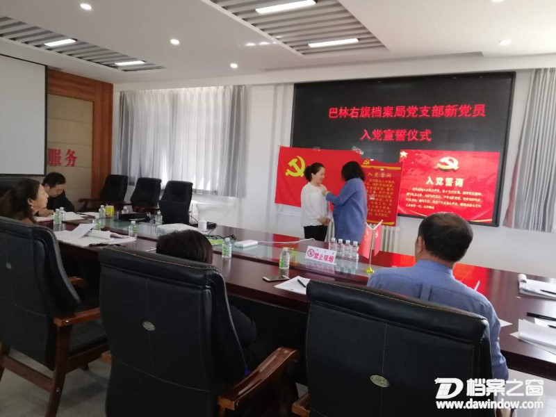 经巴林右旗直属机关工委审核批准,巴林右旗档案局党支部于2019年4月26日,为今年加入党支部的预备党员宝乐日其其格举行了入党宣誓仪式。支部书记那仁高娃主持,全体在职党员、积极分子参加了仪式。