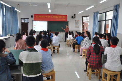 图为鄞州区家庭档案联谊会常务理事冯炜达老师为学生们送上题为《纪念五四运动100周年》的讲座
