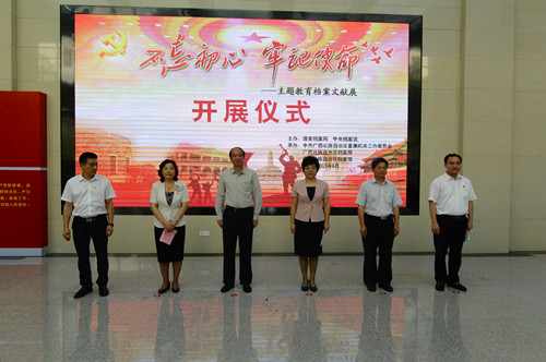 自治区党委常委、秘书长黄伟京(左三),自治区党委副秘书长、自治区档案局局长宁玉琼(右三),自治区直属机关工委常务副书记邓金玉(左二),自治区档案馆馆长黎富文(右一)等领导出席“不忘初心、牢记使命”主题教育档案文献展开展仪式