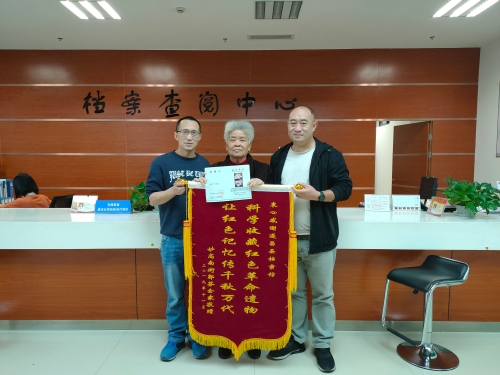 9月,郭芬辗转来到遂昌县档案馆,档案馆工作人员当即表示愿意接收这批遗物,并给郭女士颁发了馆藏证,亲自送到她家中。“档案馆肯收下我丈夫的遗物,我很感动,可算是了了我一桩心事。所以我特意送这面锦旗来,感谢档案馆工作人员的热心和善心。”郭女士深情地说。“收到锦旗很意外,我觉得这本来就是我们应该做的,能为老百姓干实事、办好事,还能丰富我们的馆藏,我们也很开心。”副馆长潘伟平说道。