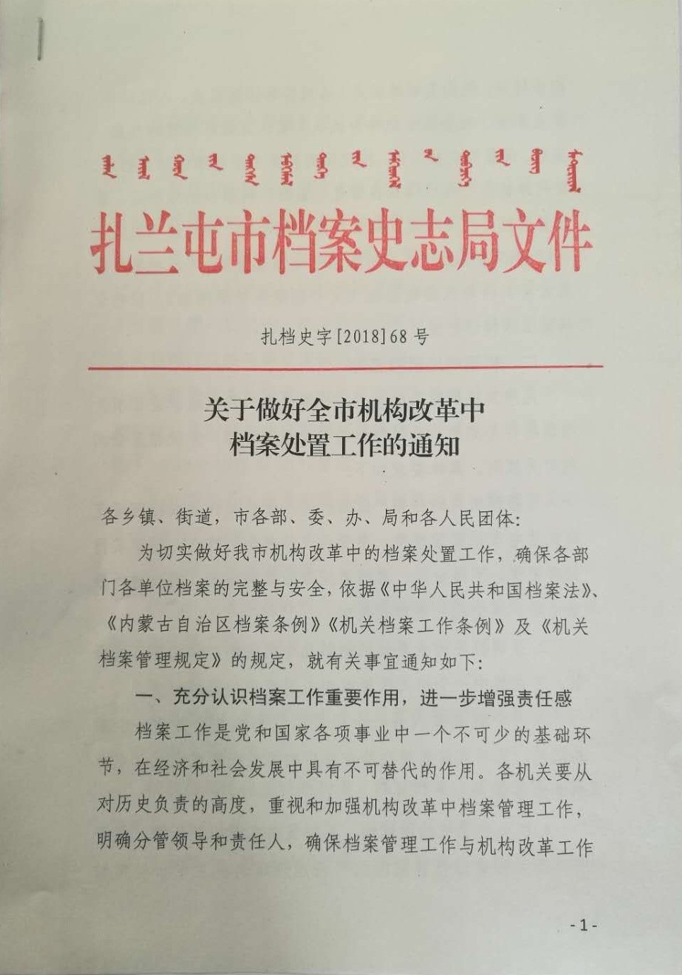 扎兰屯档案史志局印发《关于做好全市机构改革中档案处置工作的通知》