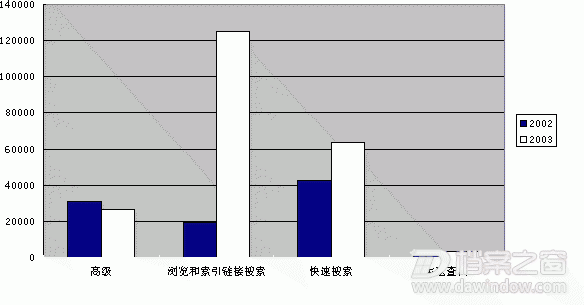 图表二:“档案汇总网”在2002年以及2003年的搜索类型剖面图