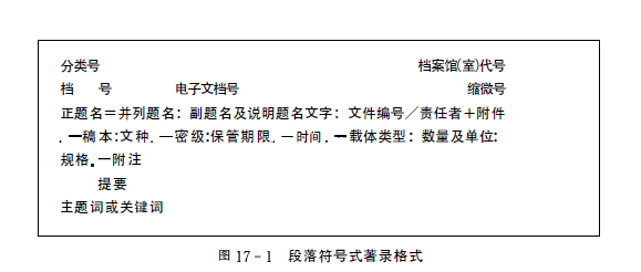 著录格式是著录项目在条目中的排列顺序及其表达方式。《档案著录规则》规定,一般采用段落符号式的著录格式,实际工作需要时也可以采用表格式条目格式。段落符号式是指将著录项目分为若干段落,每个项目之间用符号区分开来的著录格式。这种格式每一著录项目的字数不受限制。表格式是指将著录项目名称及填写位置印制成表格的条目格式,这种格式直观,易于掌握,但每一著录项目的字数受表格大小的限制。