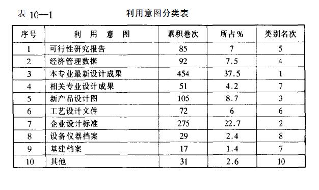 根据上述分类表可以看出,对本专业最新设计成果和企业设计标准的利用,占该单位利用需求的60%,显然,这两类就是该设计院最基本、最大量的利用需求(A类),应该作为首先考虑的选题内容;对基建档案、设备仪器档案和其他利用需求,由于它们只占总需求量的6.4%,是极次要的需求(C类),一般是不应该作为编研选题的;而处于中间地位的那些(B类)利用需求,是否作为编研选题,应该根据其他情况酌情处理。ABC法是一种综合定性和定量方法分析利用需求趋势的有效方法,应用此法的关键是对利用需求的分类要得当,使分类结果能够适应选题的要求,以便科学的确定选题的范围。