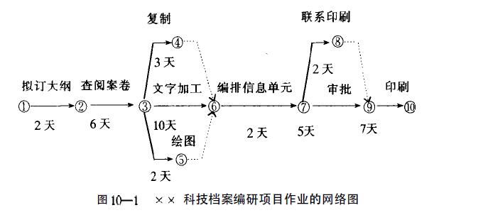 5.明确关键路线、预测网络时间。所谓关键路线,是指网络图上表示作业时间的最长的主线(如图10-2中的①②③⑥⑦⑨⑩)。关键路线是编研计划的评审重点,也是提高工作效率、缩短工作时间的关键。评审时要逐个地分析其每一作业过程时间规定得是否合理,逐一评价各作业过程的时间安排是否合适、匹配是否得当,及时调整安排不当的计划时间,尽可能的使各作业过程配合得更加紧凑、和谐。在此基础上,就能够精确地预算出这项任务完成的有效工作时间,大大提高了编研工作的计划性以及计划的准确性。