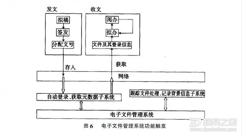这部分功能也可参见图6内容。收文机构在网上的指定的文件寄存区域获取电子文件,可能有若干机构同时获取同一份文件。这时文件已经包含电子文件管理系统捕获的一些元数据信息。电子文件管理系统跟踪被获取的电子文件,在文件处理的同时在后台自动记录各类处理信息及文件的处置状态。