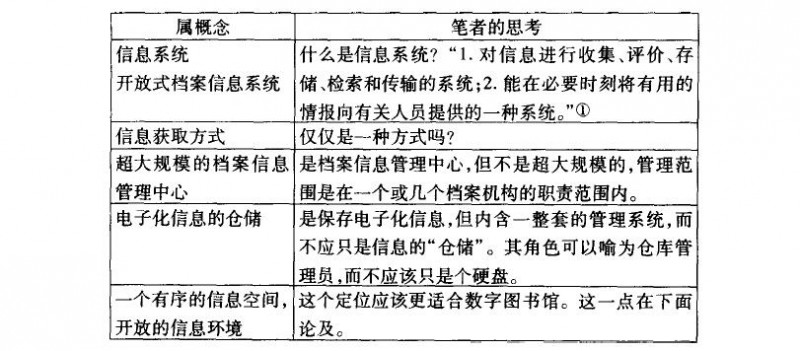 目前数字档案馆存在多种属概念。笔者选用其中有代表性的几个,结合自己的思考和疑问概括为下表: