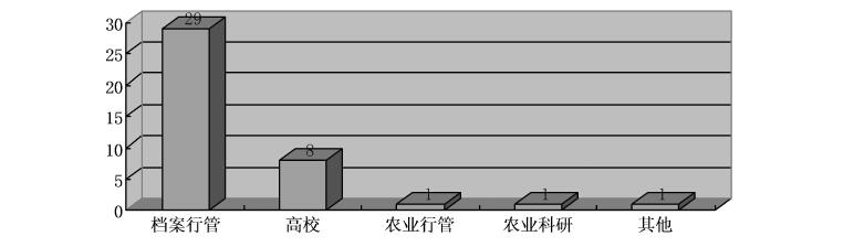 在前40个机构中,档案行政管理机构有33个,占82.5%;高校4个,占10%;农业行政管理机构1个,占2.5%;农业科研机构2个,占5%;其他单位1个,占2.5%。