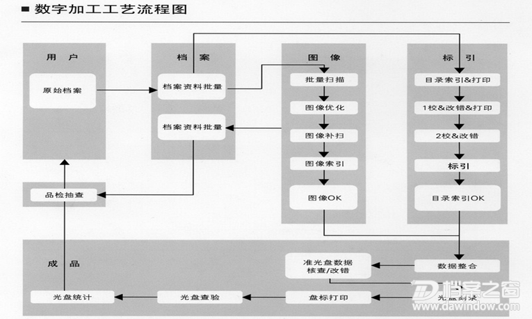 主要包括档案整理、档案扫描、图像处理、图像存储、目录建库、数据挂接、数据验收、数据备份、成果验收等。